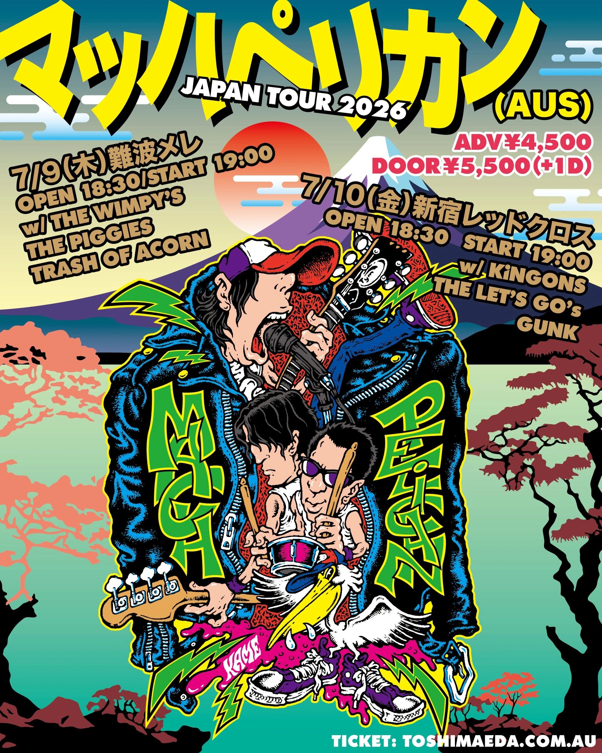 The energetic punk rock trio with Japanese roots and an Australian spirit originated in Perth in 1996 with three Japanese students—Toshi Maeda, Kei Nakamura, and Atsu Omori—at the helm.The band quickly gained momentum, eventually making a pivotal move to Melbourne in 1998.